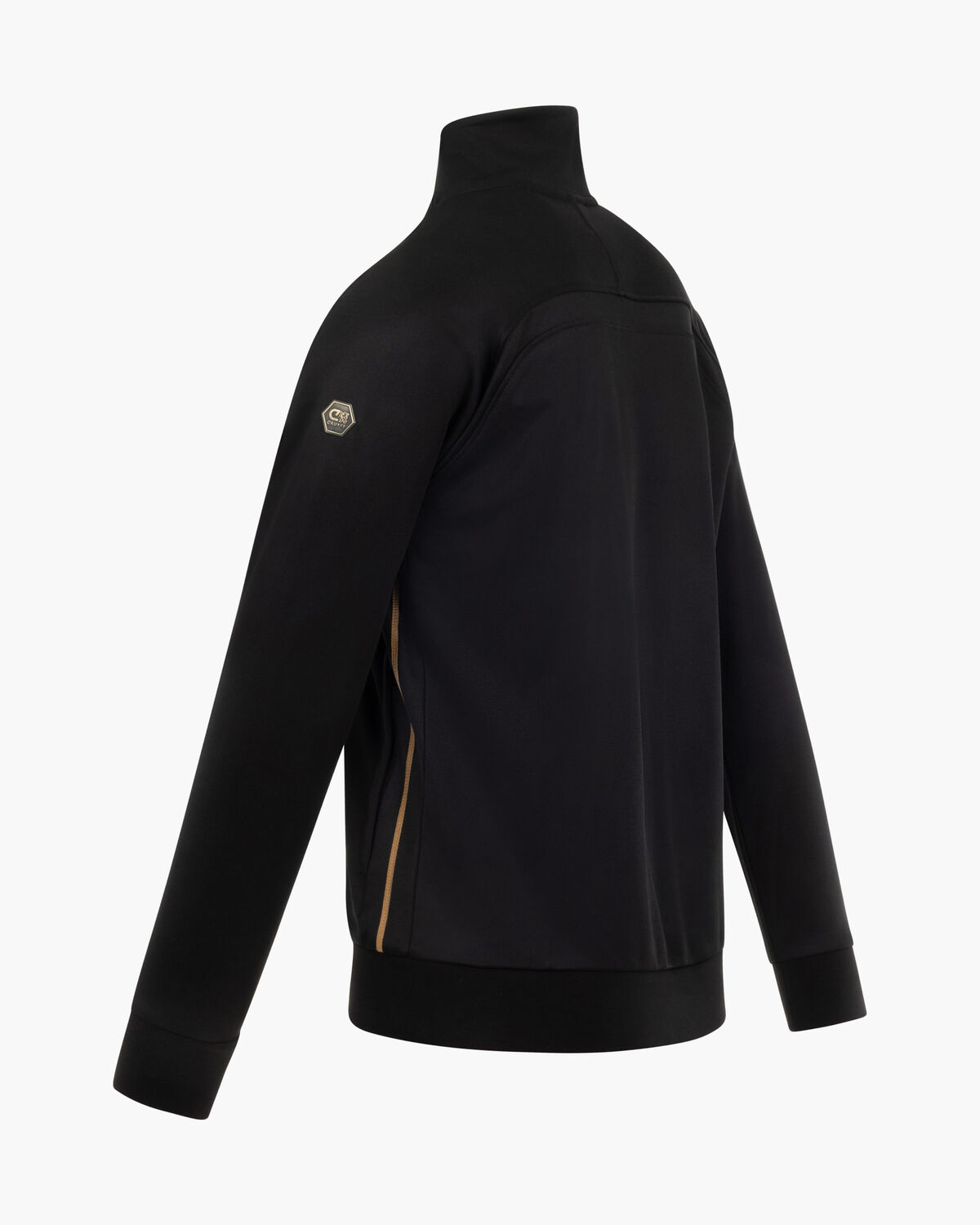 Obsidian Tracktop by Cruyff in black and gold combines style and functionality. Made from a blend of 55% polyester and 45% cotton, it offers a regular fit with a self-fabric high neck. The tracktop features carbon-coated zip pockets with a reflective stripe, a rubber hex badge on the left arm, and cut-and-sew seams on both the front and back, crafted from durable polytricot.