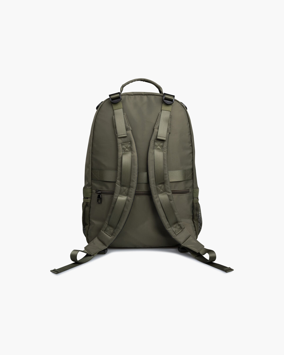 The Capo Backpack in Olive Green. Crafted from robust 100% nylon, this backpack includes gunmetal hardware, a raised gloss hexagonal front logo with C-Lion branding, and tonal tape marked with "CRUYFF". Additional features include mesh side pockets with elastic retention and a back panel luggage strap for travel ease.