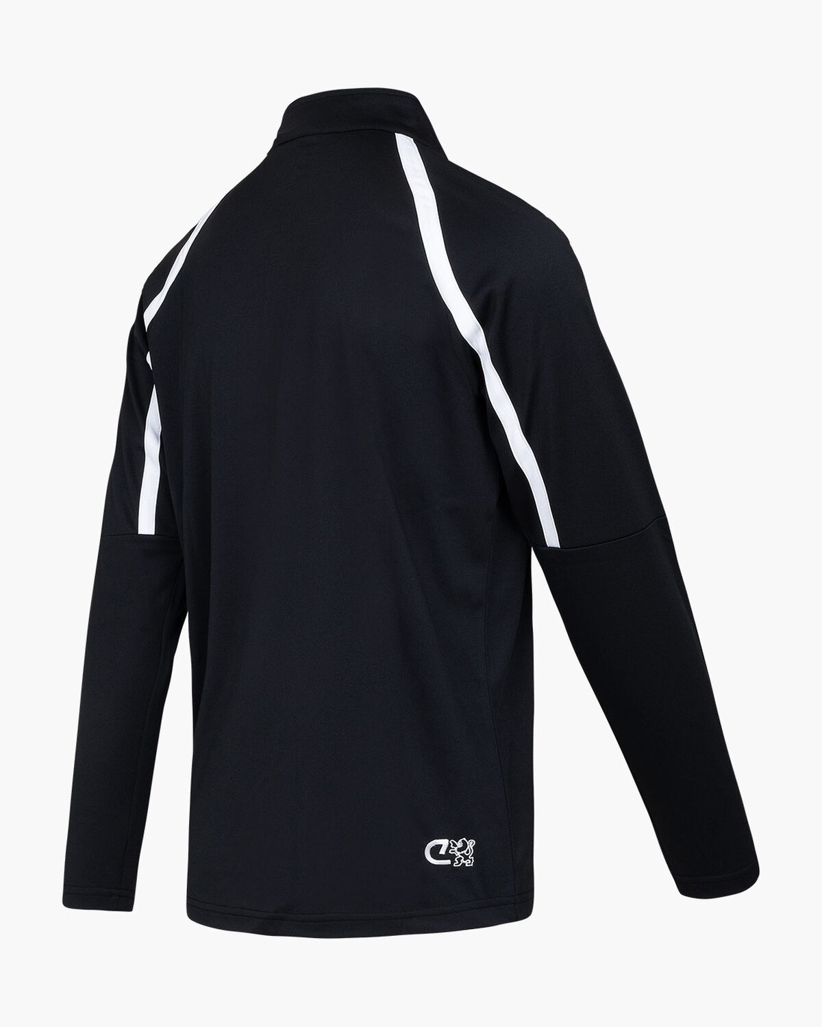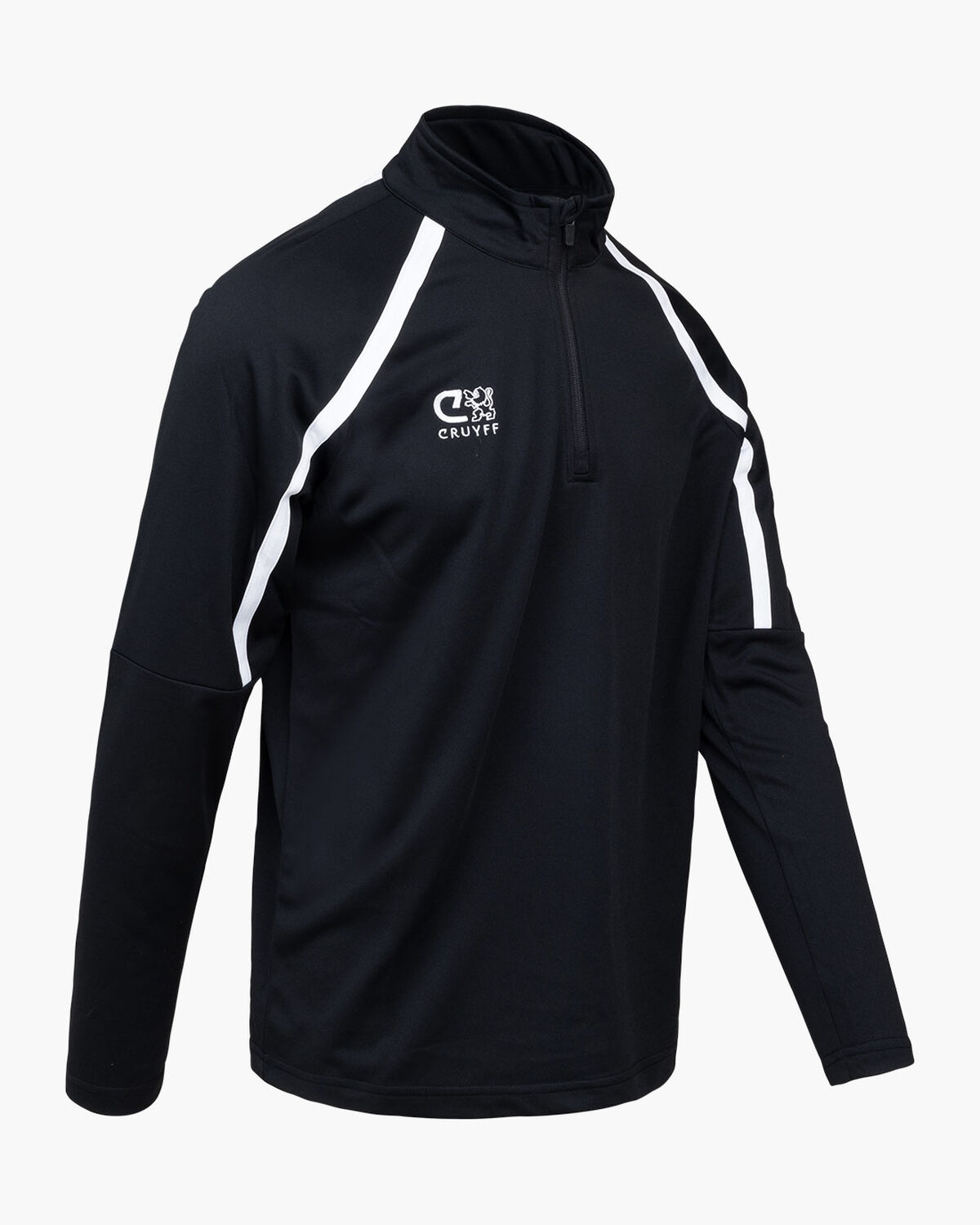 The Cruyff Tech Turn Half Zip for men in black and white. A half zip sweater with a regular fit. The polyester fabric is equipped with Cruyff Turn technology which is breathable, moisture-wicking, temperature-regulating and dries very quickly. The lining is provided with soft poly fleece. The zipper features a chin protector. Enriched with an embroidered C-Lion logo on the chest and contrasting panels around the shoulders.