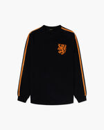 The World Cup Longsleeve Tee in Orange for men. A tribute to Cruyff and his bold move that marked the beginning of the rise of individual power in football. In 1974, the Dutch national team wore sponsored kits for the first time, but Cruyff refused the three stripes. As captain and star of the tournament, he insisted on wearing a custom version with only two stripes and his iconic number 14.