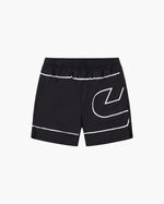 The Cruyff Boxsta men's black swim trunks. Modern swim trunks with sleek styling and functional details, perfect for the pool or beach. Made of 100% polyester, these trunks feature internal drawstrings with ties and a welt pocket at the back for practicality. The Cruyff logo is screen-printed in white on the front left and back right sides of the wearer's body.
