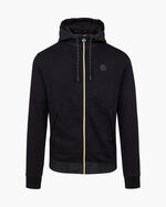 The Cruyff Aimar Zip Thru hoodie for men in black. A classic fit hoodie made from lightweight loopback fleece. Provided with two side pockets, woven nylon hems and a hood. Detailed with tonal Cruyff branding on the left chest.