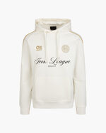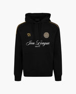 The Cruyff Icon League Hoodie in trooper black and gold for men. Made from 80% cotton and 20% polyester, this hoodie features CRUYFF branding at the chest, tonal piping, and ribbed trims. A large hood and kangaroo pocket enhance the fit for an easy, sporty silhouette. This style features a relaxed fit for laid-back comfort and ease of wear.