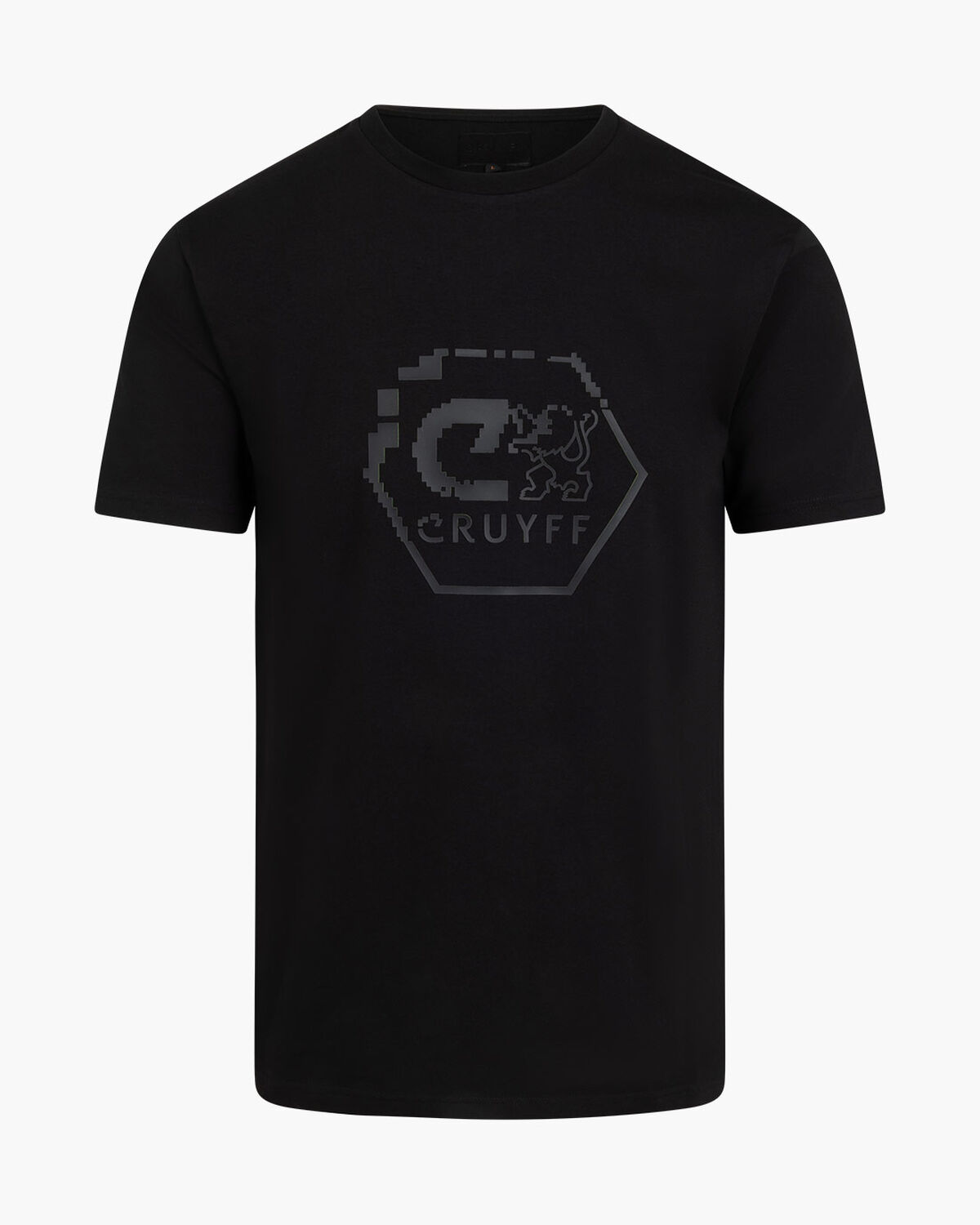 Cruyff Pix Tee in Black. Regular-fit t-shirt with pixelated C-lion logo on the chest, symbolising humanity’s digital existence. Made from 95% cotton, 5% elastane.