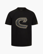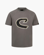 The Cruyff C-Tee in Grey and Gold for men. A 95% cotton, 5% elastane T-shirt with a minimal cut-out logo in metallic gold at the chest. Curved seam detailing across the body ensures natural shaping, while tonal inner neck tape and raised sleeve logos round out the premium finish. This style comes in a slim fit for a close-to-body silhouette.