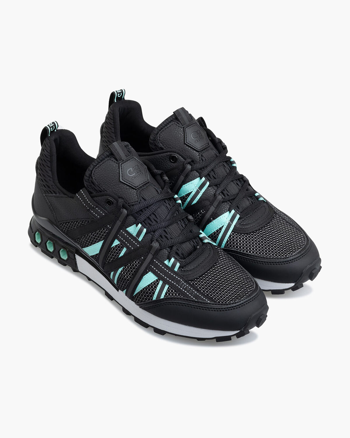 The Cruyff Fearia Hex - Tech sneaker! A hiking inspired runner mixed with luxury and athletic elements. The Fearia comes with a comfortable EVA midsole with a football inspired hexagon studs downsole, including the Hex-Tech technology at the back. Hex-Tech is lightweigh, offers shockabsorption and natural airflow. This colourway has a multi material upper consisting of titanium mesh, spandex, tumbled leather and a diamond embossed material on the heel. The most notable feature on these runners is the reflective webbing all over the side.