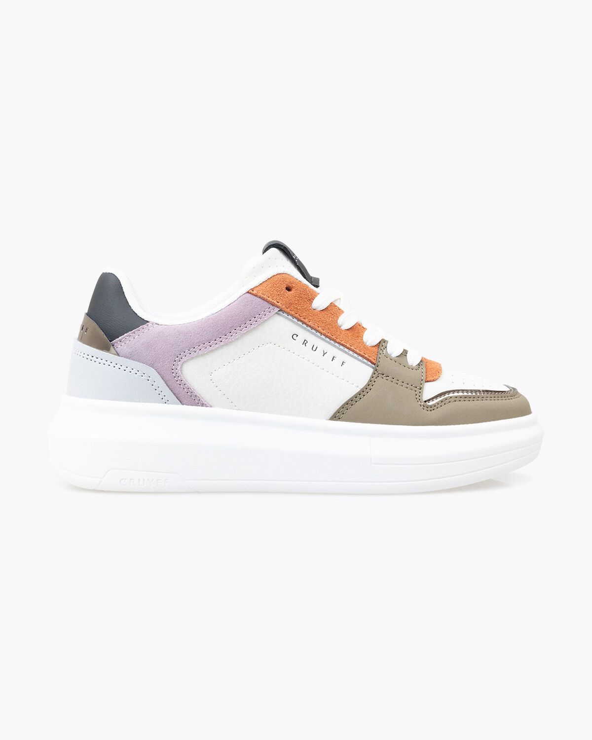The Cruyff Tennis Court in pastel color mix. These women's everyday cupsole sneakers are made of soft artificial leather in combination with cow suede in a mix of lavender, olive and rust colors over an off-white base. Finished with soft gold specchio details providing a glam twist to this colorful mix.